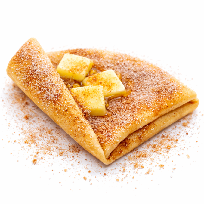 Warm crepe brushed with salted butter and coated in cinnamon sugar with golden syrup. Simple, comforting and irresistibly nostalgic.