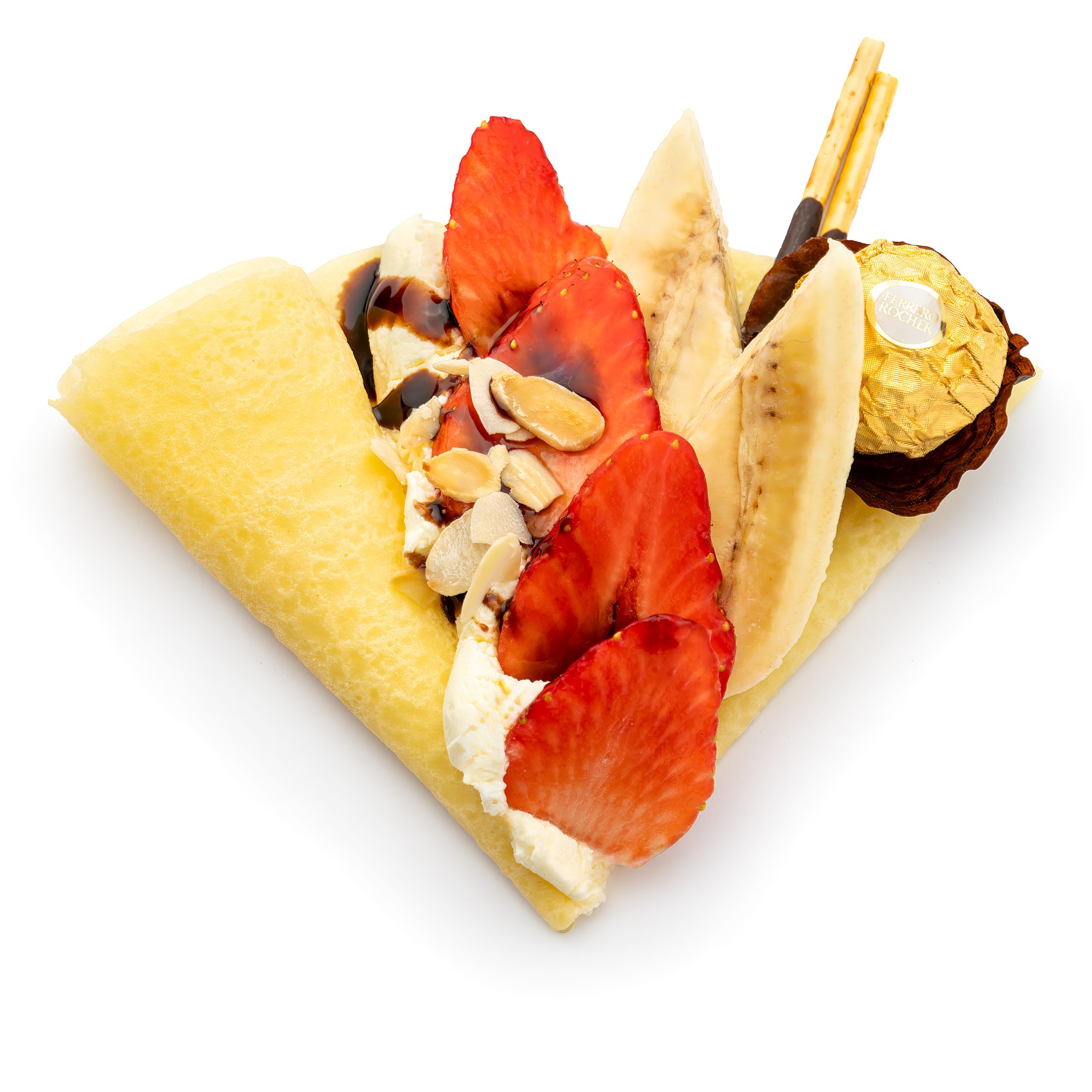 Strawberries and bananas with Nutella, Ferrero Rocher pieces, almond sprinkles and chocolate Pocky. A luxurious crepe full of textures, chocolate and nutty crunch.